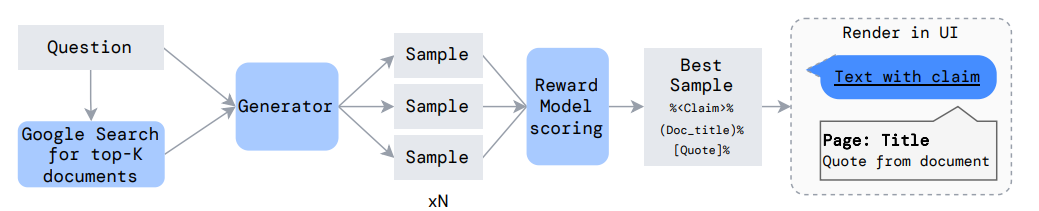 The output samples from this stage are then rated by humans based on how plausible they are and how well supported by the cited evidence. This feedback is used to fine-tune the LLM. [It’s interesting that LLMs are now good enough to produce anything reasonable here. It probably would not have been cost feasible to generate enough samples from human - I’d guess that could be ~50x as expensive. So LLM research has enabled creation of datasets to make them even better.]